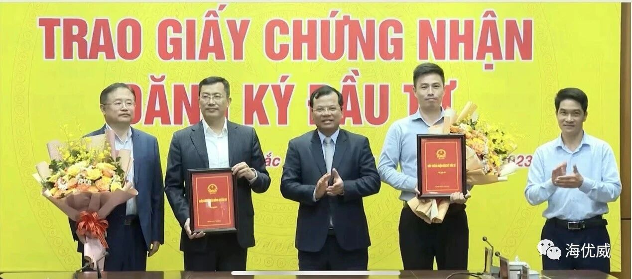 【2023年5月4日,越南,北江省】越南北江省投資登記證頒發(fā)儀式于五月四日下午在北江省政府舉行。北江省副省長范世俊先生親自向海優(yōu)威總經(jīng)理李民先生頒發(fā)證書,意在支持和鼓勵海優(yōu)威在越南建設(shè)膠膜工廠的投資計劃。儀式上,雙...